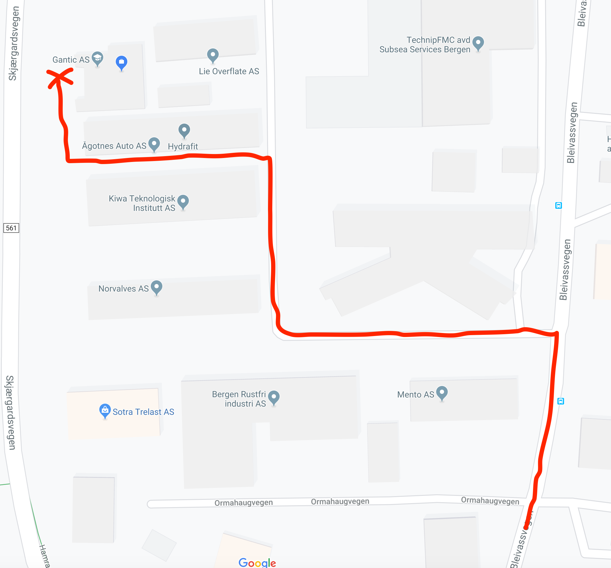 Bleivassvegen 34, Ågotnes Næringspark. Ta til høyre i rundkjøringen på Ågotnes og forbi bensinstasjonen. Ta andre veien til venstre, følg veien mot Norske Ventiler. Sving til høyre og ta 3. veien til venstre ved Gantic bygget. Kjør til enden av bygget og ta til høyre rundt hjørnet. Parkering på grusplass innenfor porten.